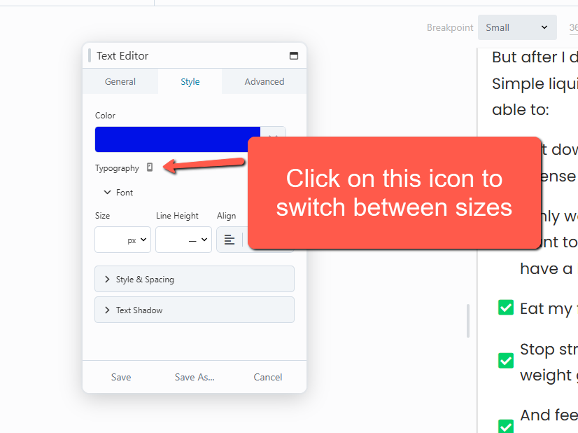 If you want to change the font style (size, color, spacing, alignment, etc) only on a phone, click on the icon until it becomes a phone. Then, any changes you make will apply just to phones (or very small screens). That way you can make sure your text looks good on all screens